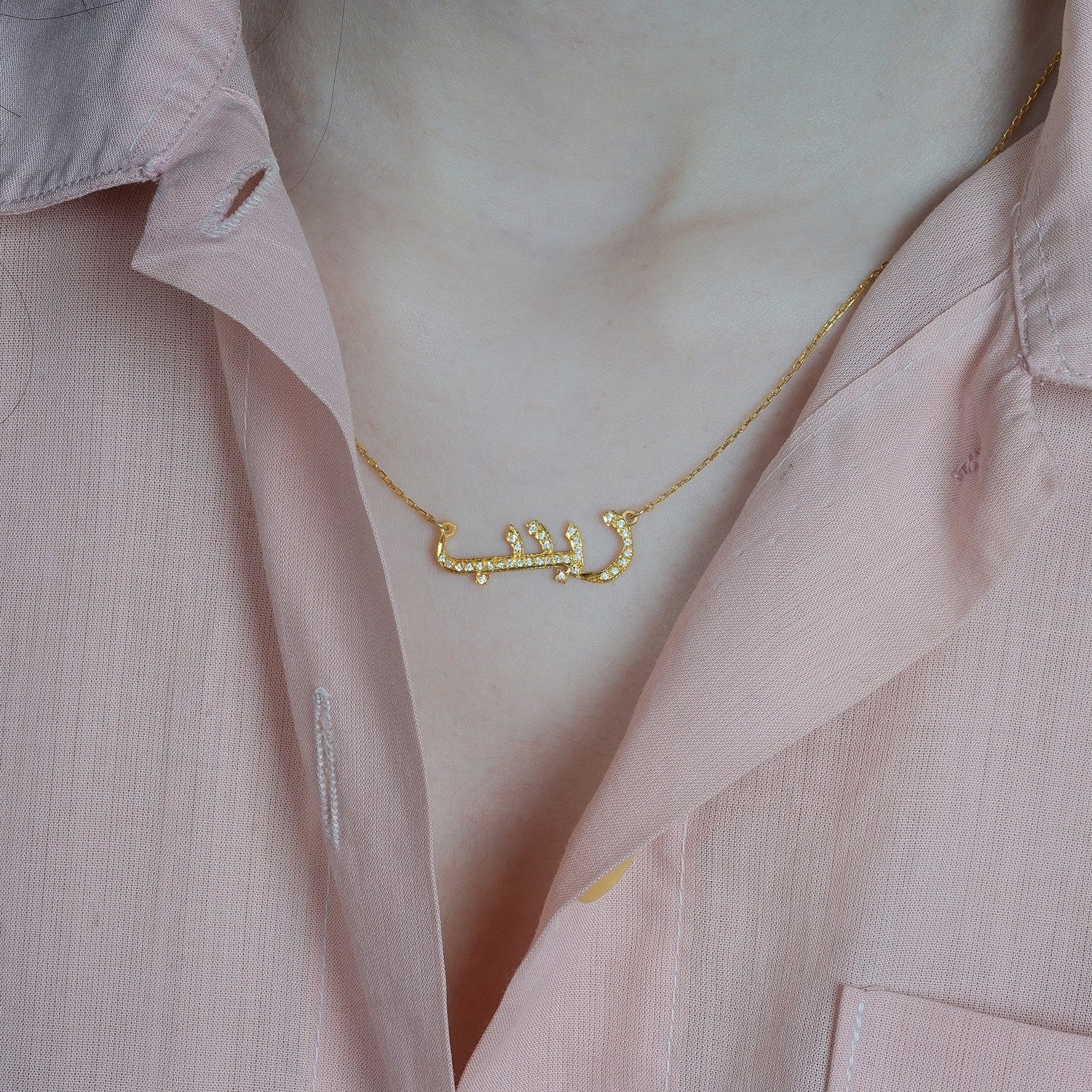 Add some Middle Eastern charm to your look with our Arabic Name Necklace with shimmering crystals! With the name or word of your choice inscribed in a beautiful Arabic script, this necklace makes a thoughtful gift for birthdays, anniversaries and special occasions — a memory that will last a lifetime.